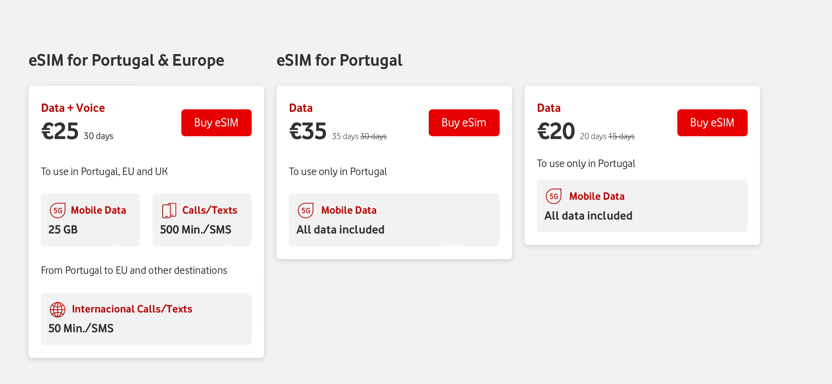 The other alternative is to choose Vodafone Travellers eSim Card package where you get unlimited data for just €20 for 20 days and €35 for 35 days. The other alternative is an eSim package with 25 GB of data, 500 minutes phonecalls and 50 minutes to international numbers. More details are here
