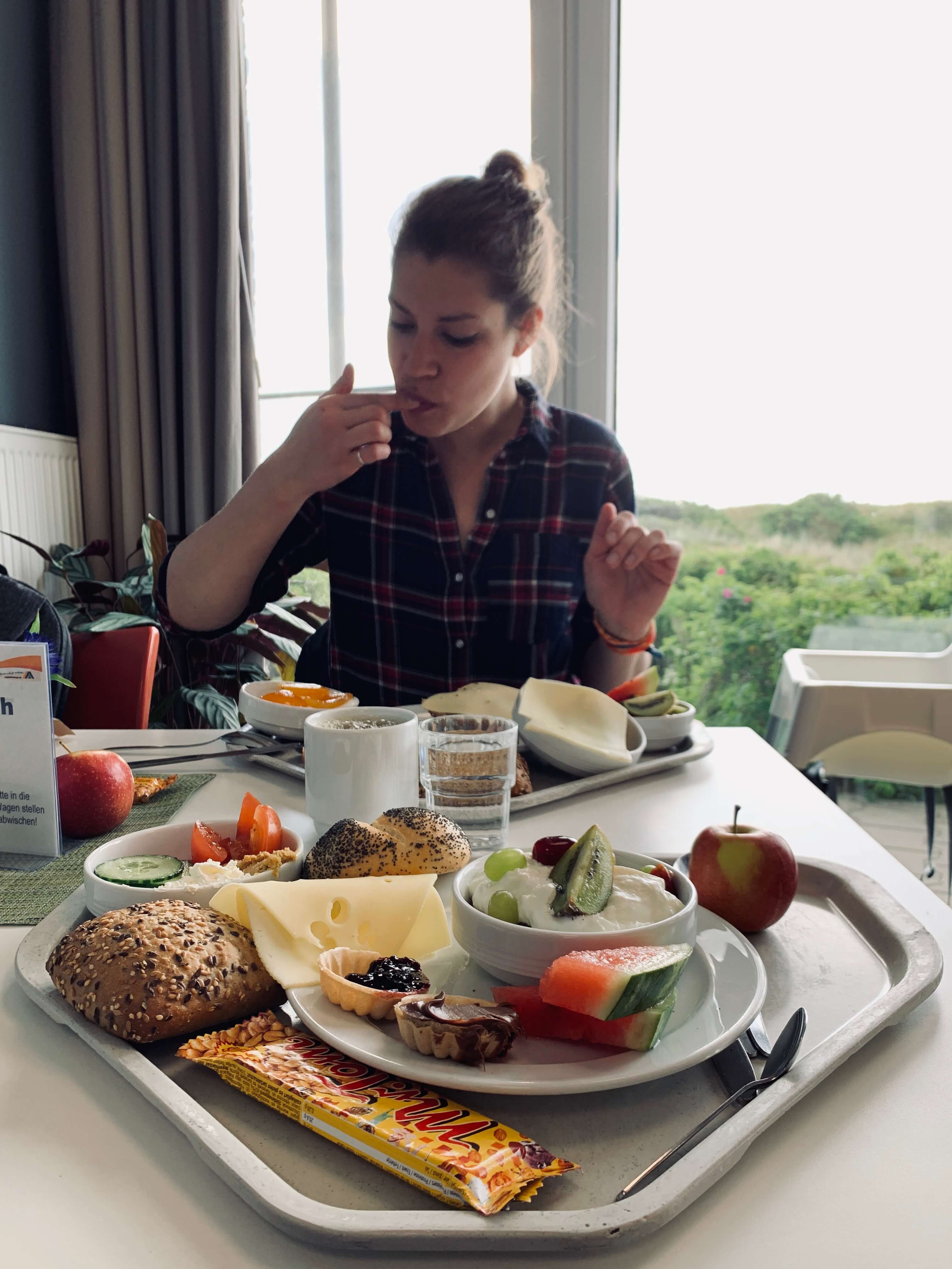 I’m pretty excited that we were sleeping IN THE TOWER! Yup. My heart is racing like a kid to get to my room. Except. We’re on the seventh floor of the tower just for the views. No lift. My heart is pounding, groaning by the time I reach the 7th floor. I’m never coming down from my room. However, moment I do reach our room on our first evening, the sun is about to set. We have a breathtaking panoramic view of the sun setting from one window and spot the sandy fringes of a beach nearby. From the other window, we can see the path we walked all the way from the ferry terminal. I see in the distance, the ferry we had arrived on from Harlesiel, pushing out into the golden shimmering sea. I probably spend a good hour just soaking in the views before I sit down on the bed. I was grateful we got the tower room. At least for the exercise which would be needed after all the delicious food and drinks we were going to savour over the next few days.