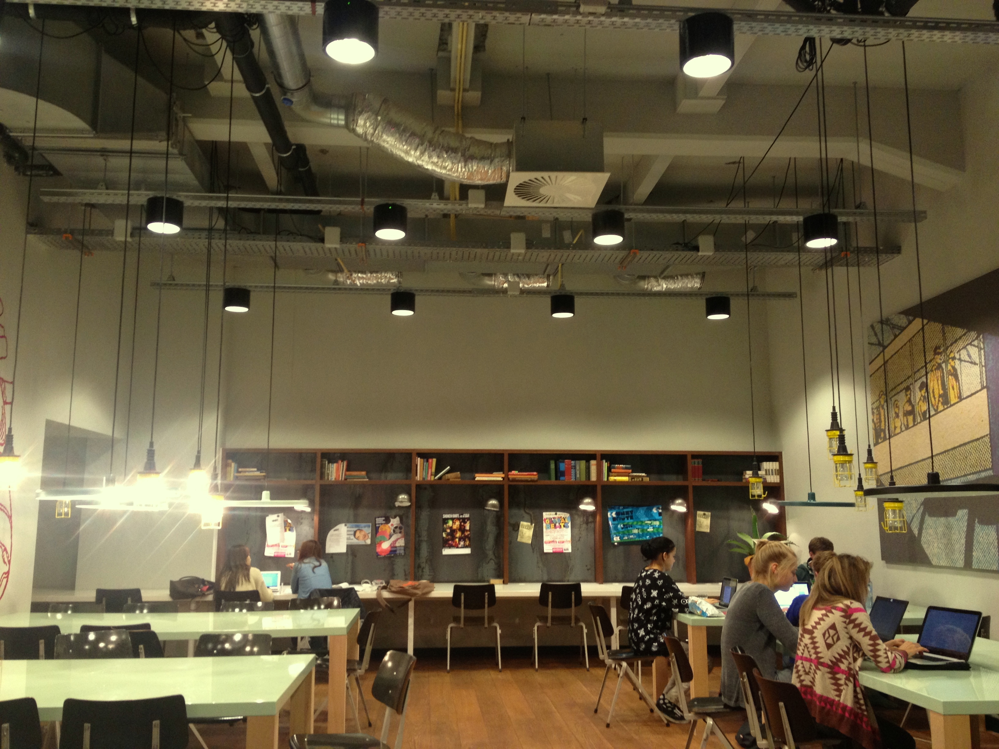 Low lighting creates a nice relaxed ambience and you have long narrow tables where a few students are scattered , working away on their laptops.