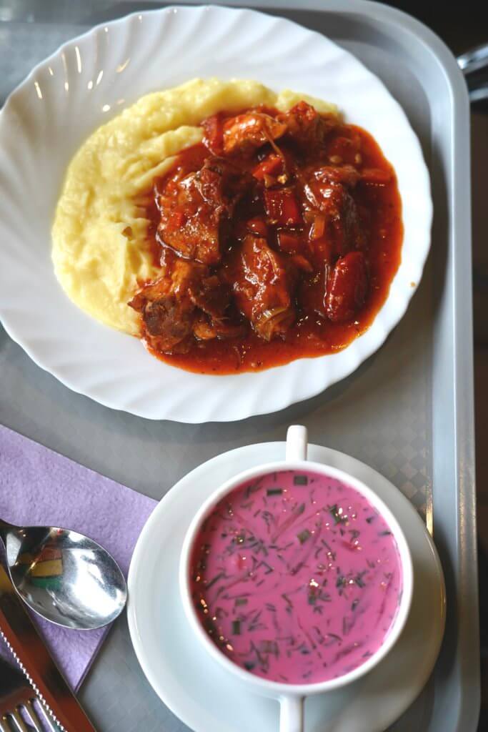 The dishes are very affordable and you have a lot of choice. I tried some goulash with mashed potato- was super tasty. The most interesting dish was definitely the cold beet soup aka Aukstā zupa With an unusual, deep pink color, this soup is made with beets, cucumbers, kefir and sometimes a hard-boiled eggs. There is a topping of dill and scallions a dash of vinegar to give that extra tart flavour.