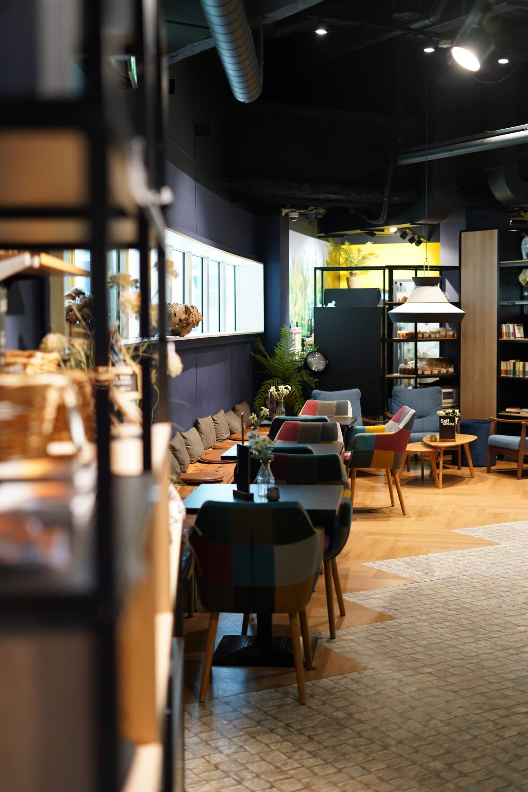 There are no TV sets on the premises. There are groups of tables where you can play board games or chess with friends. There is also a Book Swap shelf where you can grab a book. The decor is a low key Danish Modern if that makes any sense. All in all, a very relaxed vibe.